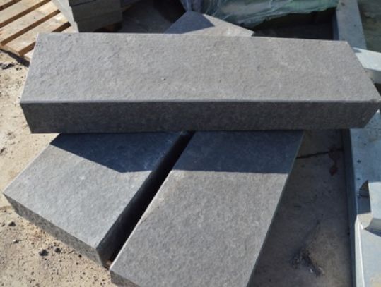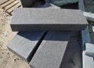 Unsere Blockstufen SANOKU Basalt ELEGANCE -satiniert-Oberflächen allseits geflammt & gebürstet, Längskanten 7mm/45°, sonst 4mm/45° gefast, ein Traum aus Vietnam.